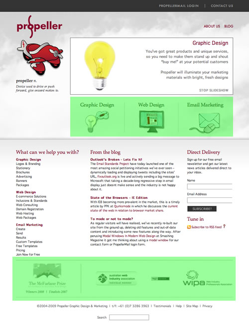 09 July 2009CSS Sprites are nothing new so I’m not going to reinvent the wheel – rather I’m going to explain how we’ve employed them in the new propellerglobal.com to minimise HTTP requests, decrease total image file-sizes and limit the overall page weight. All combined these small improvements dramatically reduce the time it takes a browser to download and render the page.